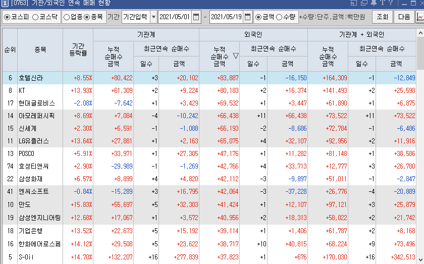 5월 코스피 외인 순매수 순위를 보자. 5월은 외인 매도세가 높아서 순매수가 큰 의미가 없을 수도 있지만 그래도 그와중에 외인이 사준 종목 1위가 호텔신라네? LG 유플러스도 보인다. 업종은 다양하게 분포되있는 것 같다.