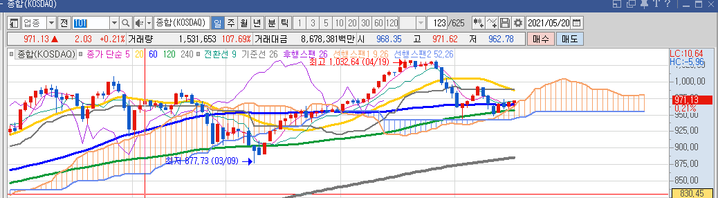 코스닥과 코스피는 둘다 구름위를 달리는 중이다. ㅎㅎ 아직까지 추세가 빠지지는 않고 지켜주는 모양세다.