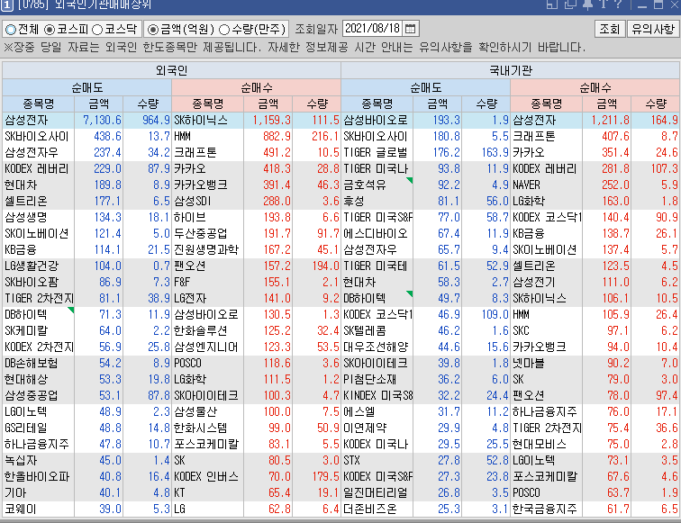 기관은 삼전을 많이 샀고, 어제는 인버스 사더니 오늘은 레버리지 샀네?? 불나방들인가...