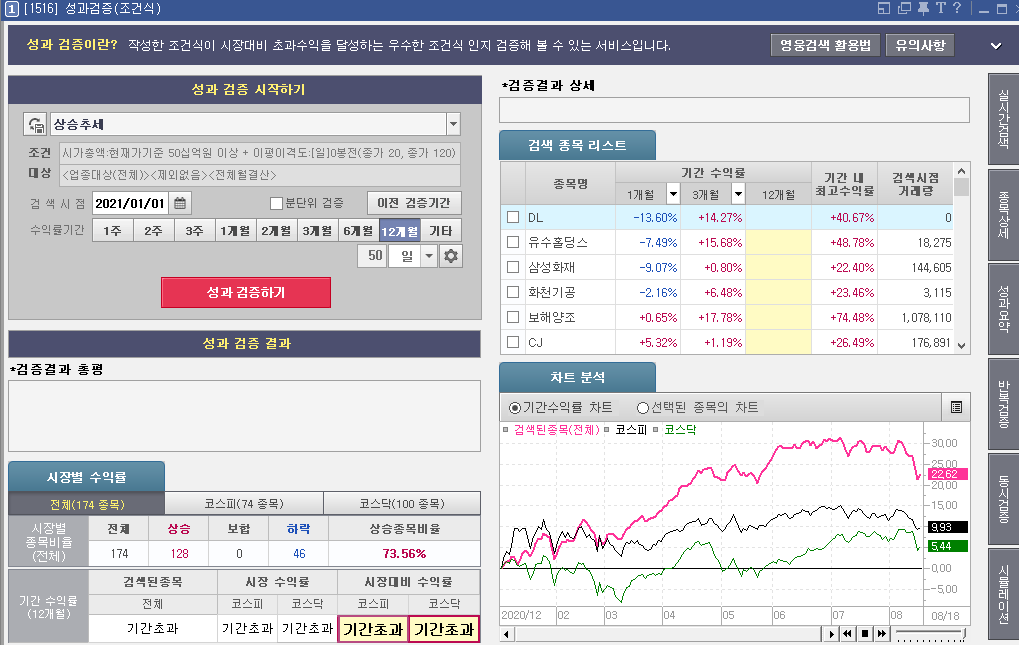 음?? 내 조건식이 코스피 코스닥 수익률을 이기네? ㅋㅋ 종목이 좀 많이 나오긴했는데...여기서 나오는것만 사도될듯