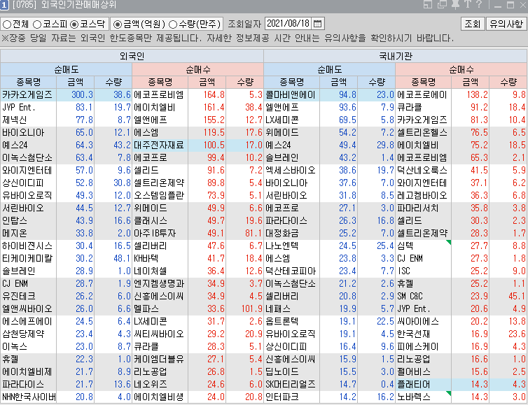 외인 순매수 상위랭크에 나의 계륵같은 에이치엘비(바이오)를 빼면 2차전지로 도배가 되어있다. 외인은 코스닥에서도 2차전지를 사랑하는 것 같다. 기관은 어떨까? 외인보다는 2차전지 비중이 적고 바이오/헬스케어가 보인다. 카카오게임즈도 보이고...그 아래로는 뭐..비중이 작으니 패스