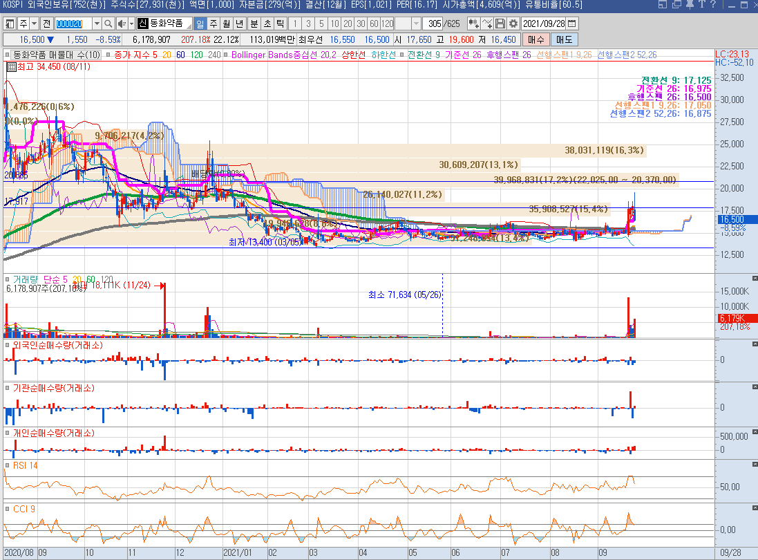 동화약품은 우리가 잘 알고있는 까스활명수와 후시딘 등을 만든 의약품 업체로 주가는 계속 바닥을 향해가다가 하락을 멈추고 오랜기간 횡보중에 있다. 거의 1년가까이 횡보하다가 최근 상승을 보였는데 롤러코스터를 매우 심하게 태우고 있다. 다만 현재 가격도 횡보한 가격과 크게 차이 나지는 않기 때문에(현재가 16,500원, 횡보가격대 15,000원) 손절선 정해놓고 도전해 볼만한 가치는 있다고 본다. 어차피 횡보가격대에서 더 물타면되고 그 가격대 매수자들은 더 큰 상승을 원해서 안팔 가능성이 더 높기 때문이다.