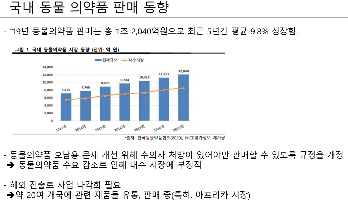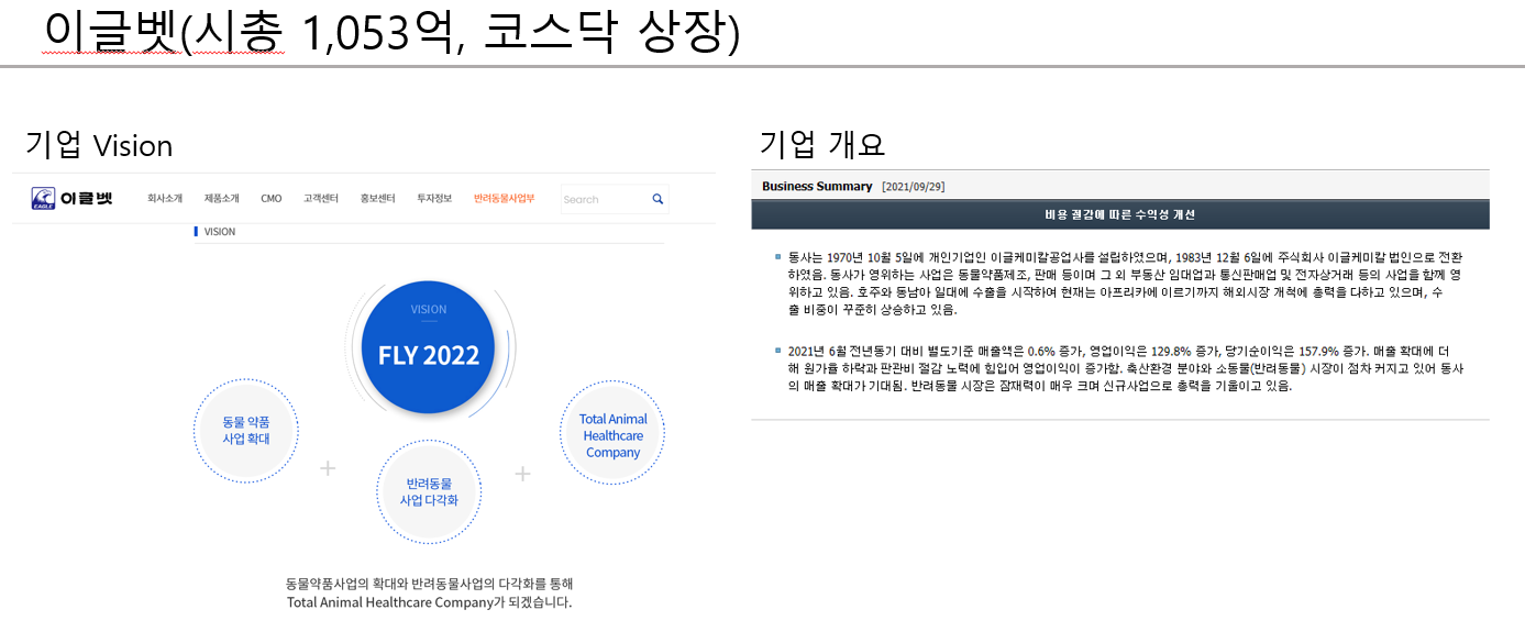 기업 시총과 Vision. 동물 의약품 사업 확대 중이며 반려동물 사업 다각화, Total Animal Heathcare 회사를 목표로 함