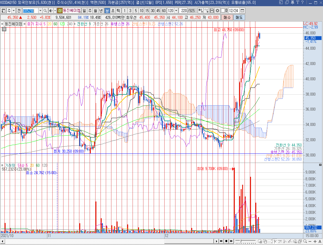 크리스마스 이브(금요일) 동진쎄미켐은 45,350원으로 마감했다. 전고점은 전날 46,750원으로 윗꼬리 길게 만들고 쭉~ 내려왔지만 다시 올라가고 있다. 거래량도 많이 터져서 개미털고 외인횽들이 매수한듯? 이번 주에는 외국인이 순매수해주었고 개인은 순매도했다. 기관도 순매수함.