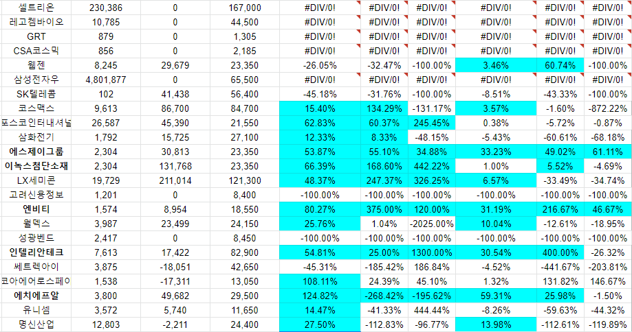 Bold 체로 표시된 종목들이 둘다 상승한 종목들이다. 적자, 혹은 전분기, 전년대비 하락한 경우에는 색칠되어있지 않다.