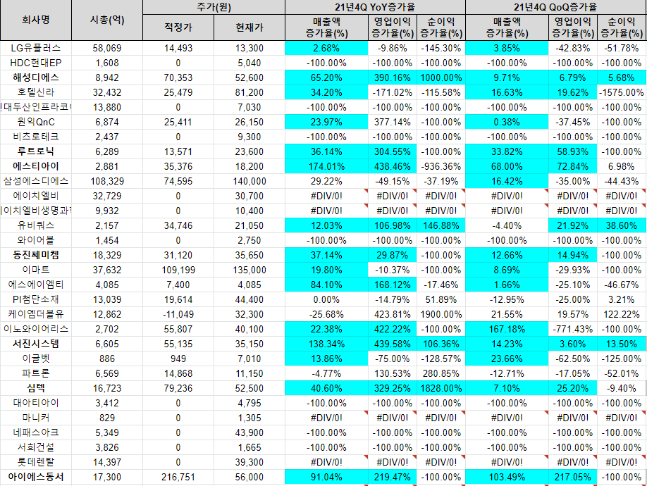 '21.4Q 실적을 정리하면서 YoY / QoQ 모두 선방한 기업들 위주로 조사해보았다. 물론 내가 관심있는 종목들 중에서만 추려내었다. 전체 종목은 너무 많아서...못함.