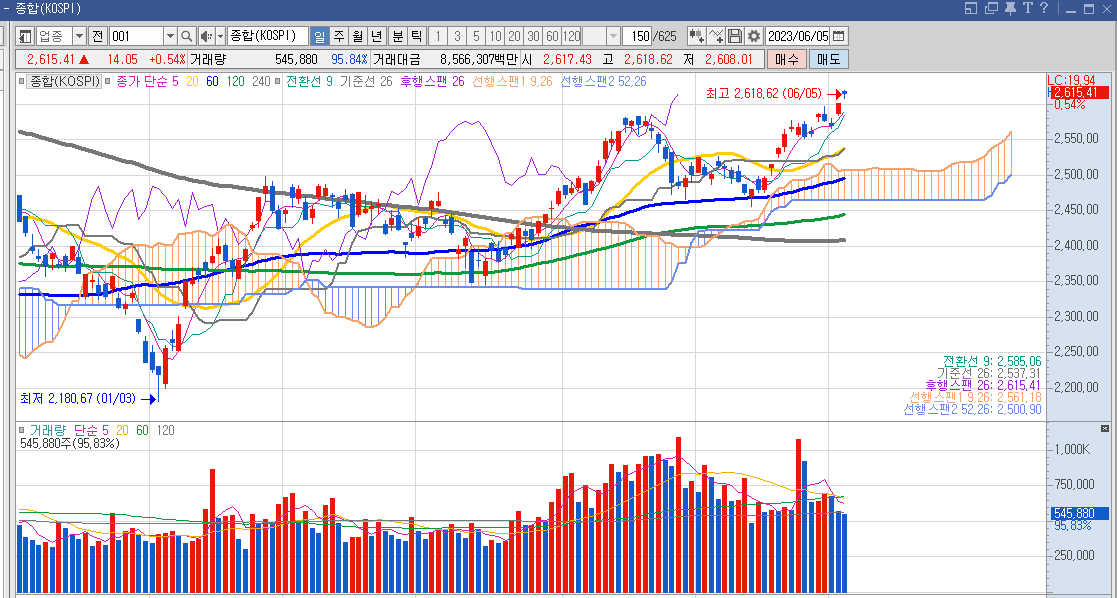 그래도 코스피는 올해 초 최저점인 2,180 대비 2,615까지 상승해서 거의 20%의 수직 상승을 했다.